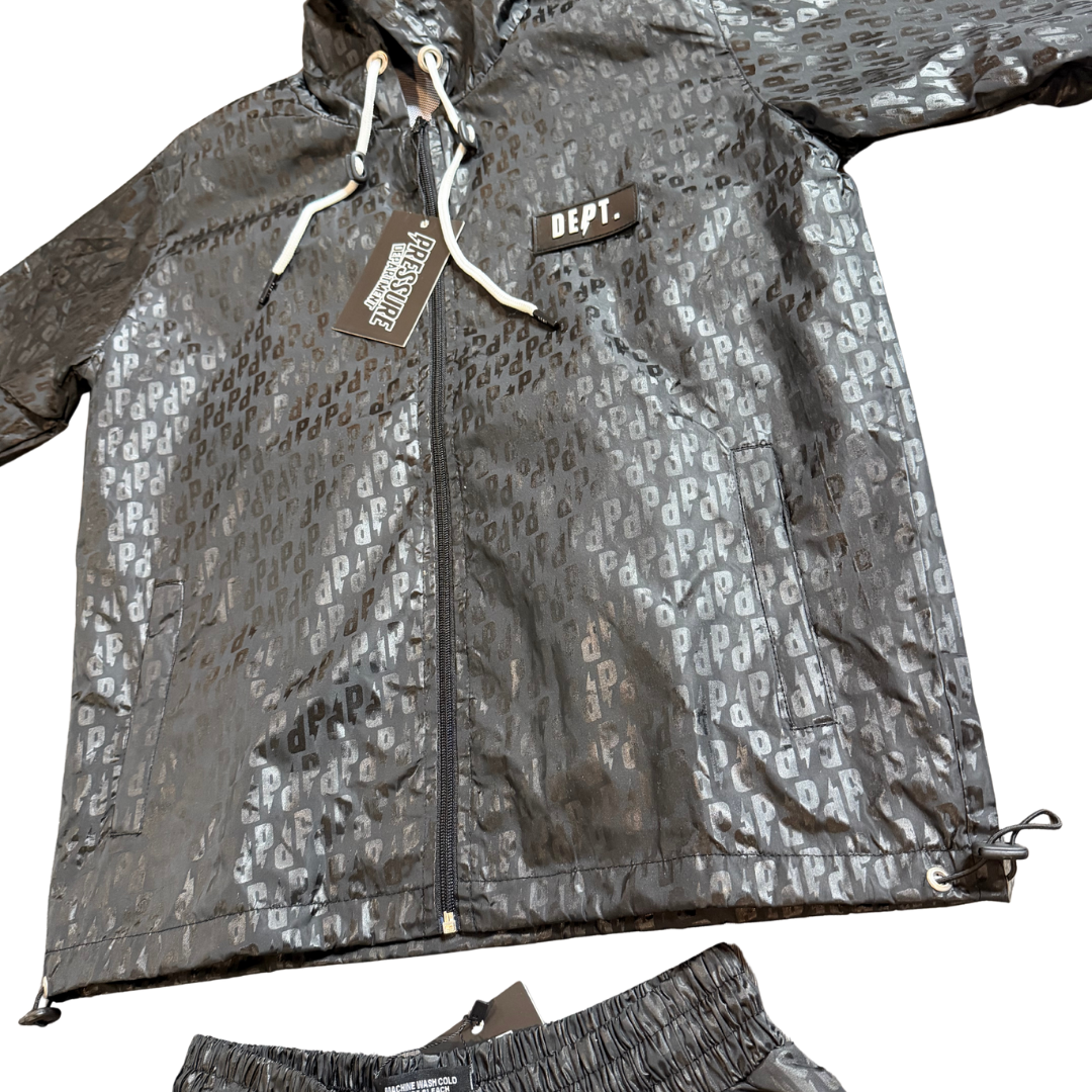 The P Monogram Set features premium nylon shorts designed for durability and breathability. Equipped with an adjustable drawstring, these shorts ensure a secure and personalized fit. Highlighted by a striking lighting P logo monogram, this set merges functional performance with refined style suitable for active lifestyles and casual wear.