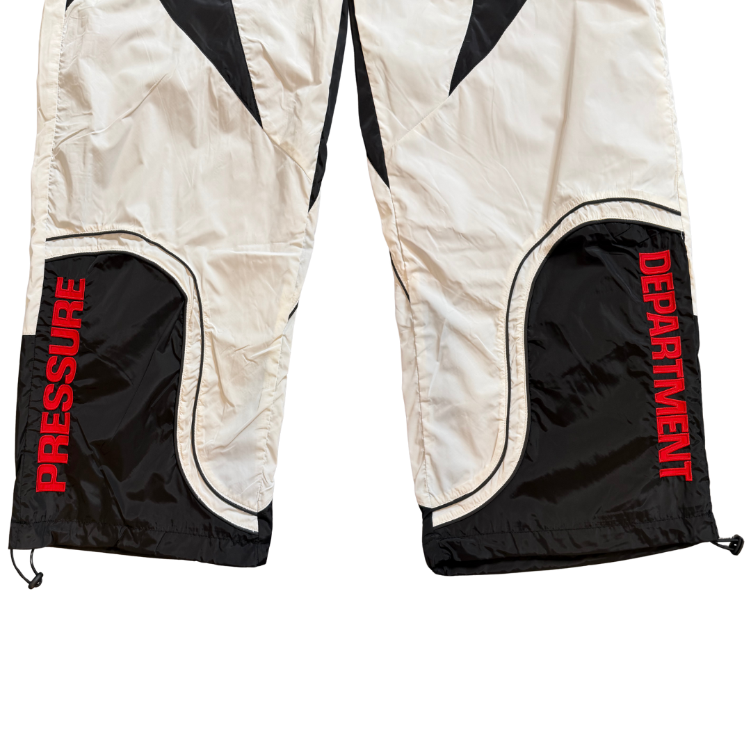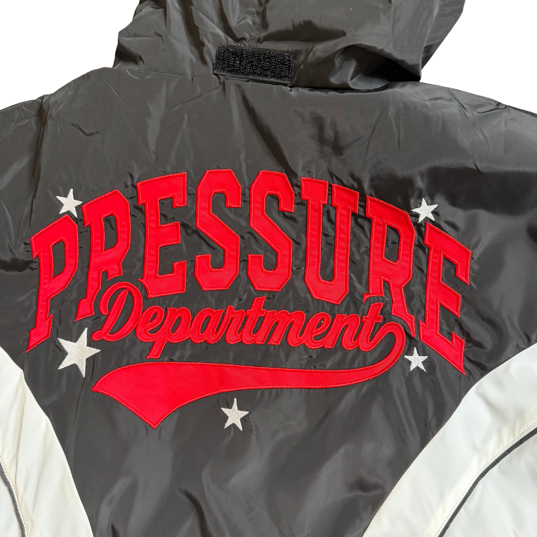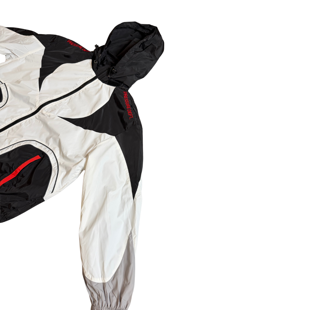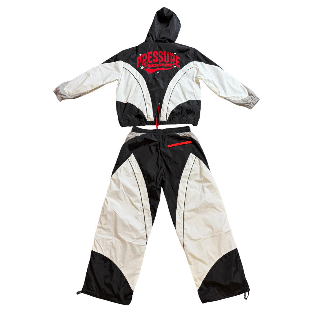 The PD Windblock Set combines a windbreaker with a concealed hoodie and drawstring pants, offering versatile protection and comfort. The windbreaker features an adjustable flared bottom for a personalized fit, while the pants ensure secure wear with their drawstrings. Both pieces showcase a subtle embroidered logo, highlighting refined craftsmanship. Designed for performance and style, this set adapts seamlessly to changing weather and activity levels.